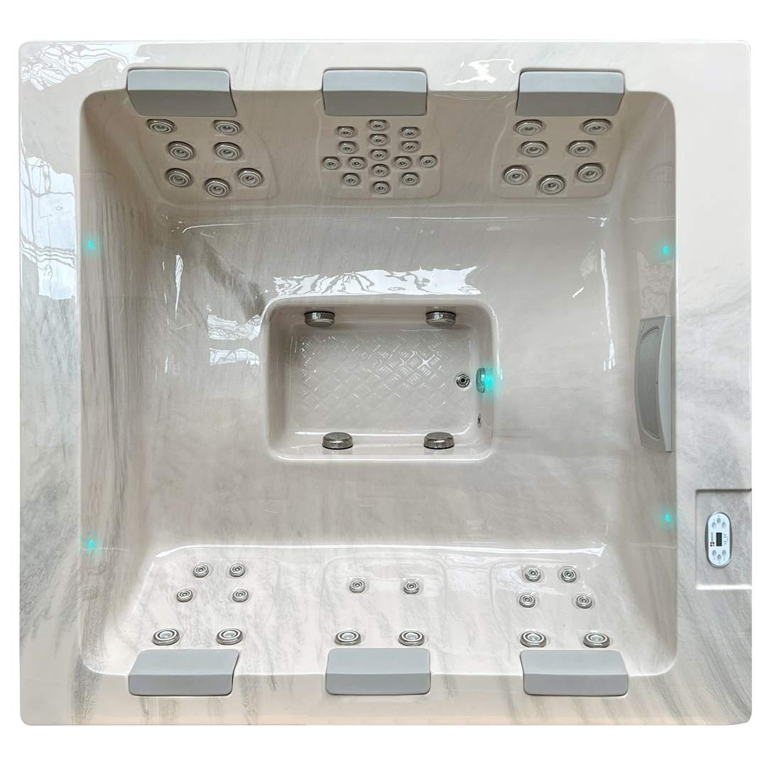 Dimensions: 243 x 224 x 93 cm Nombre de place assise: 4 Nombre de place allongée: 2 Nombre de jet de massage: 48 Ozone System Energy Efficient Pompe de filtration Système Intérieur Led Starbrite Hybrid Heating™ Volume: 1570 litres Poids à vide: 380 kg